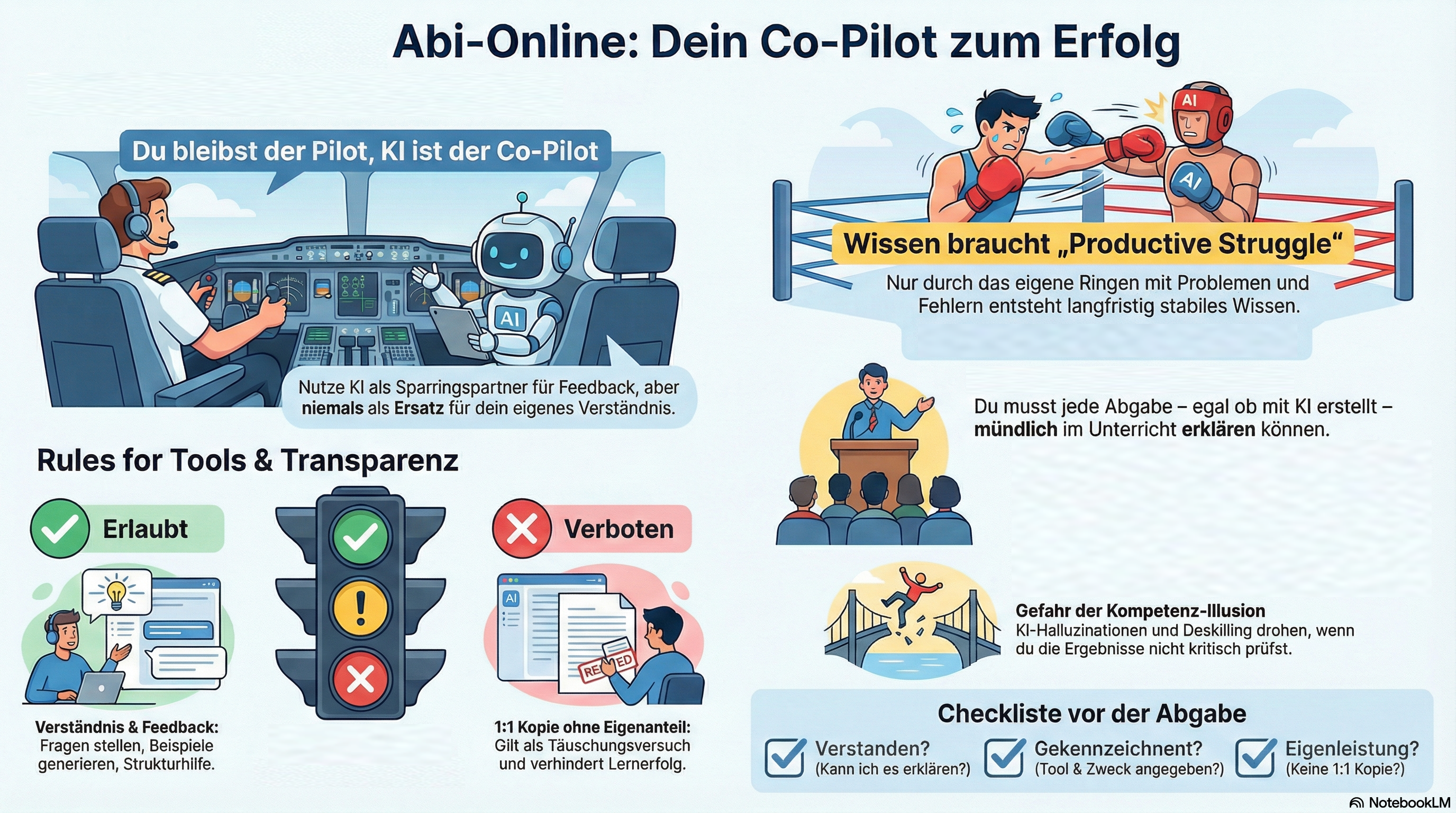 Entscheidend ist daher nicht ein formal perfektes Ergebnis, sondern ein nachvollziehbarer Lernprozess: Alles, was du abgibst, solltest du fachlich erklären, begründen und im Unterricht vertreten können.